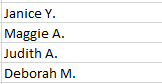 4. Add a period to the first initial (likely A). Select the cell and drag it to copy the cell contents for all the instances of that initial. This should fix any capitalization errors too. Repeat this for B-Z.