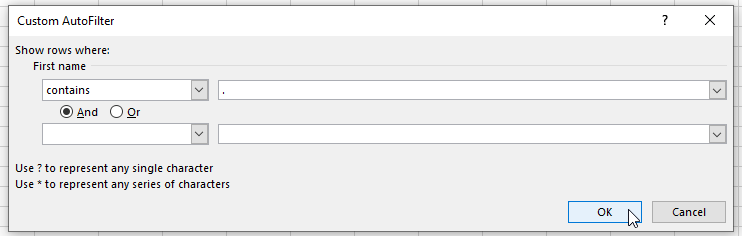 2. On the first name column, click the filter drop-down box. Select Text Filters > Contains.